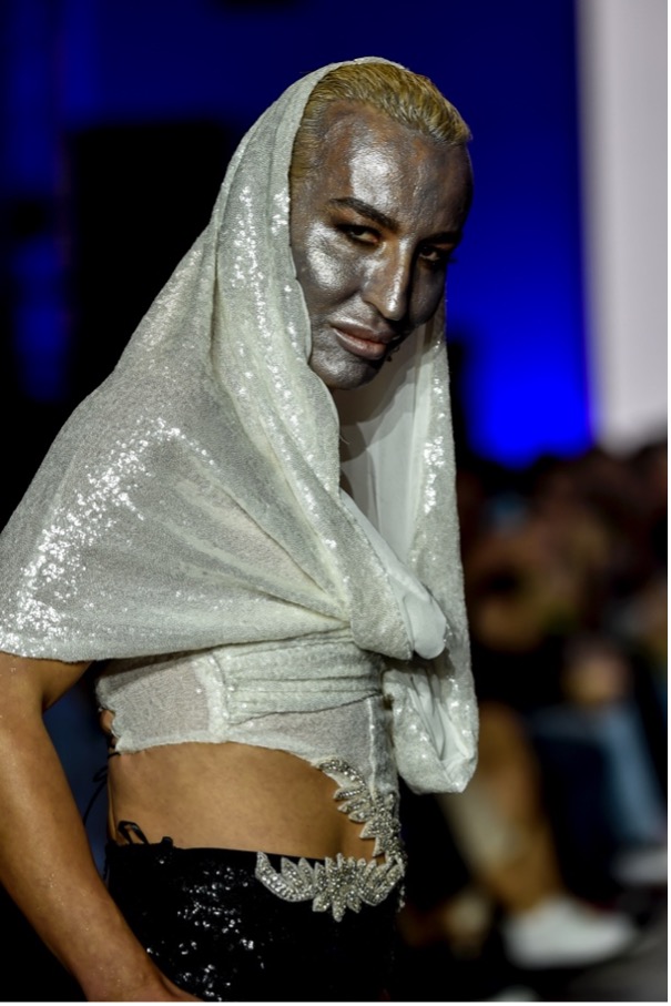 Elton opened the Suzana Perić fashion show where he wowed onlookers carrying a golden mannequin sample with skirt and his face covered in metallic silver make-up. Elton also closed the show wearing a black and white sequined dress with a cape.